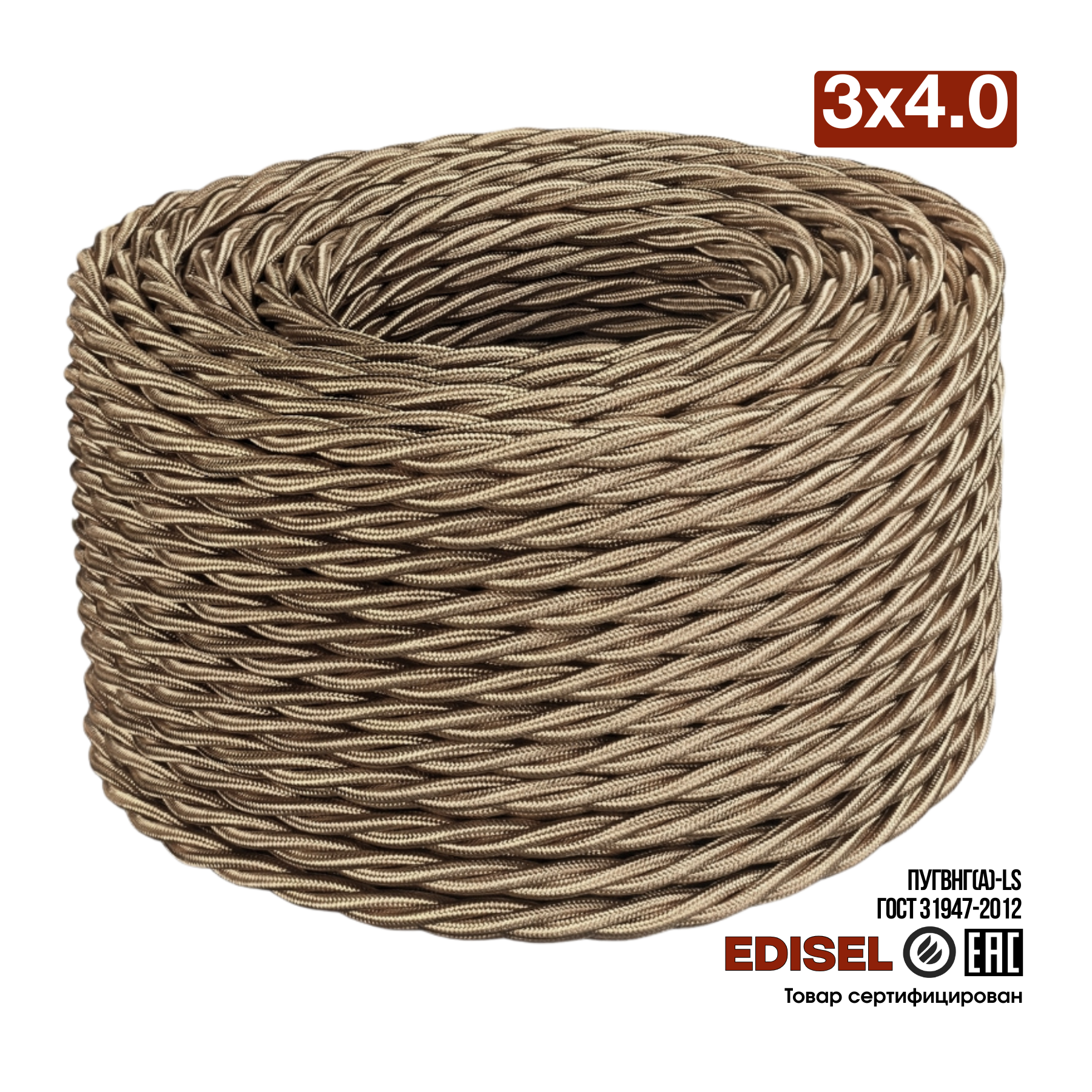 Витой ретро провод 3х4 бронзовый шелк EDISEL ПРВ (ПуГВнг(А)-LS)