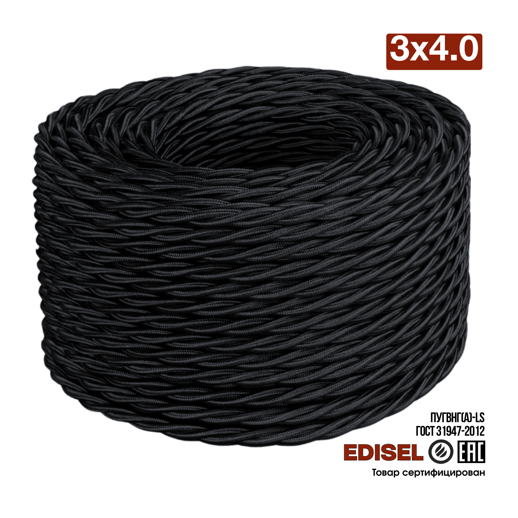 Витой ретро провод 3х4 черный EDISEL ПРВ (ПуГВнг(А)-LS)