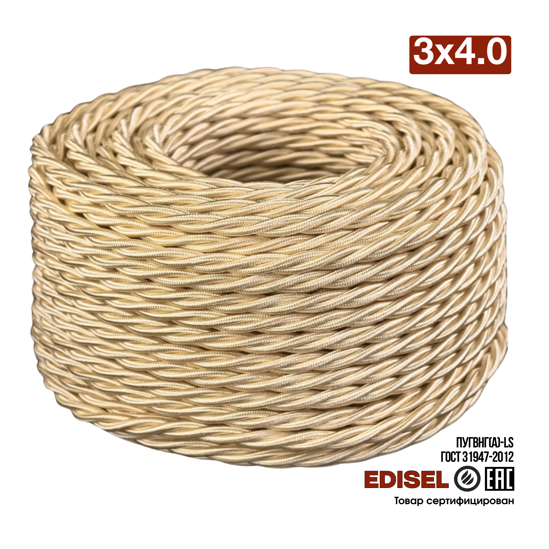 Витой ретро провод 3х4 песочный шелк EDISEL ПРВ (ПуГВнг(А)-LS)