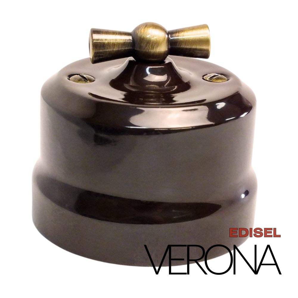 Выключатель керамический поворотный в ретро стиле коричневый с бронзовой ручкой с функцией двух-клавишного для открытого монтажа в помещении